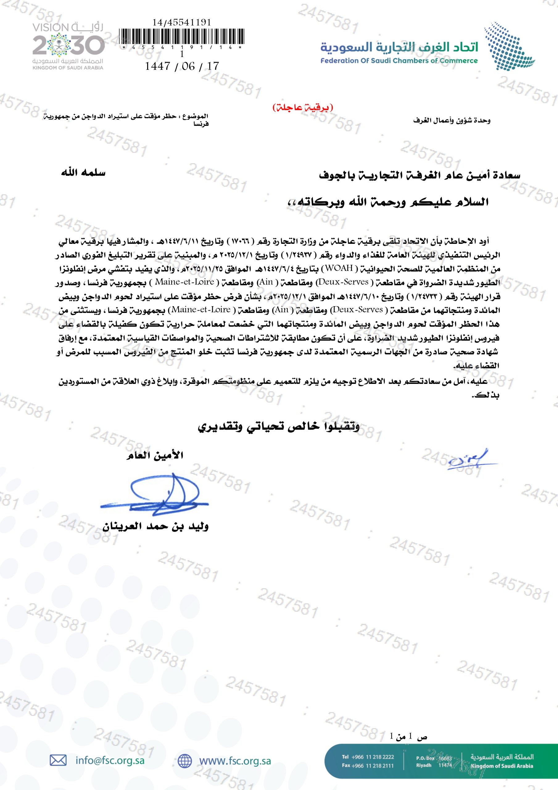 (العربية) حظر مؤقت على استيراد الدواجن من جمهورية فرنسا