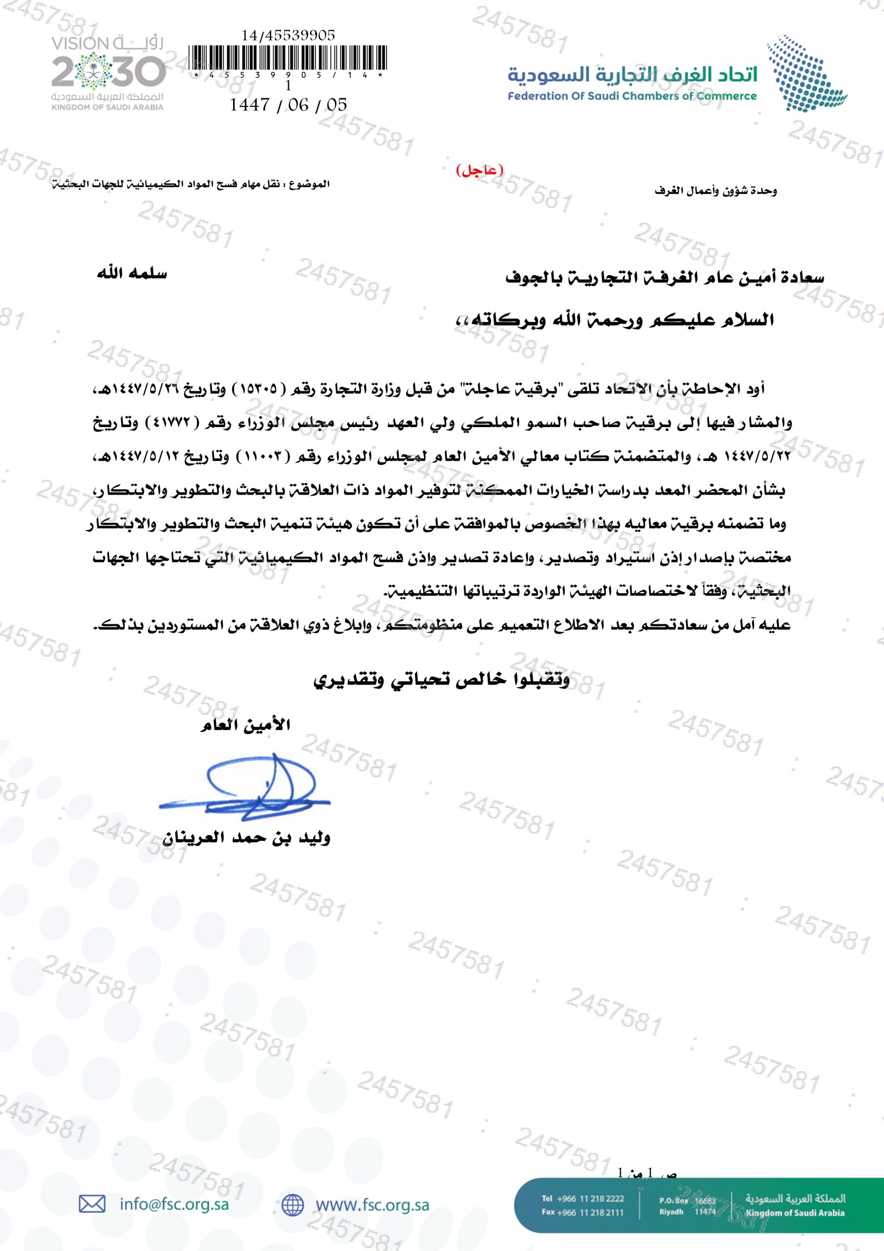 (العربية) نقل مهام فسح المواد الكيميائية للجهات البحثية