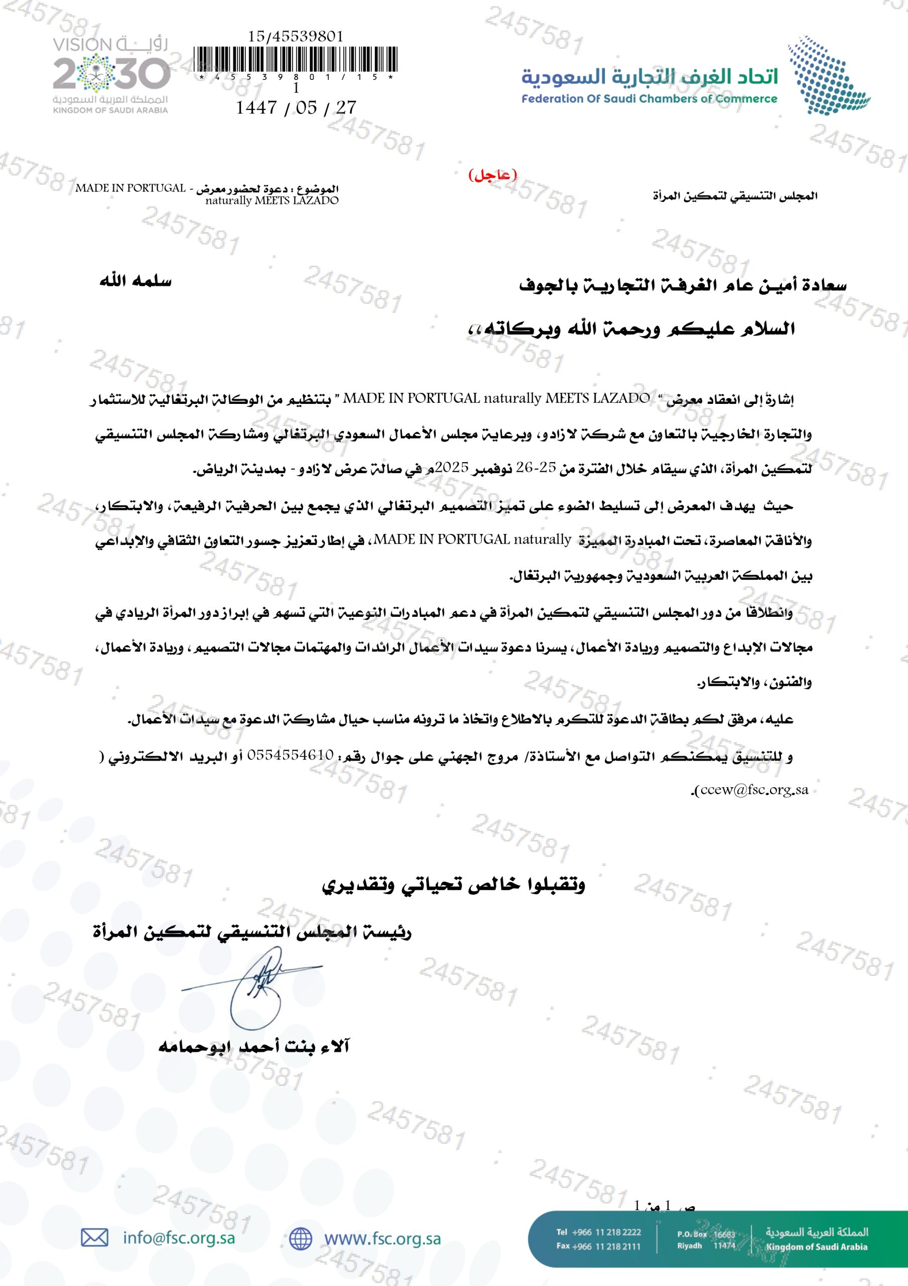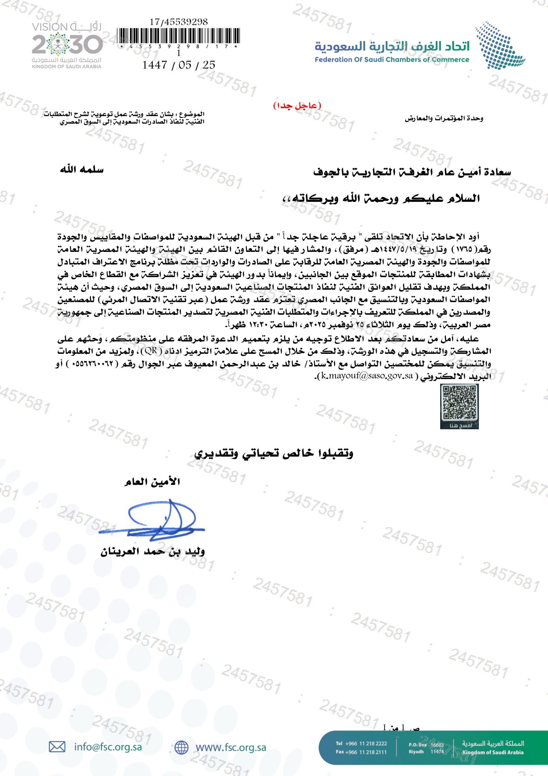 (العربية) بشان عقد ورشة عمل توعوية لشرح المتطلبات الفنية لنفاذ الصادرات السعودية إلى السوق المصري