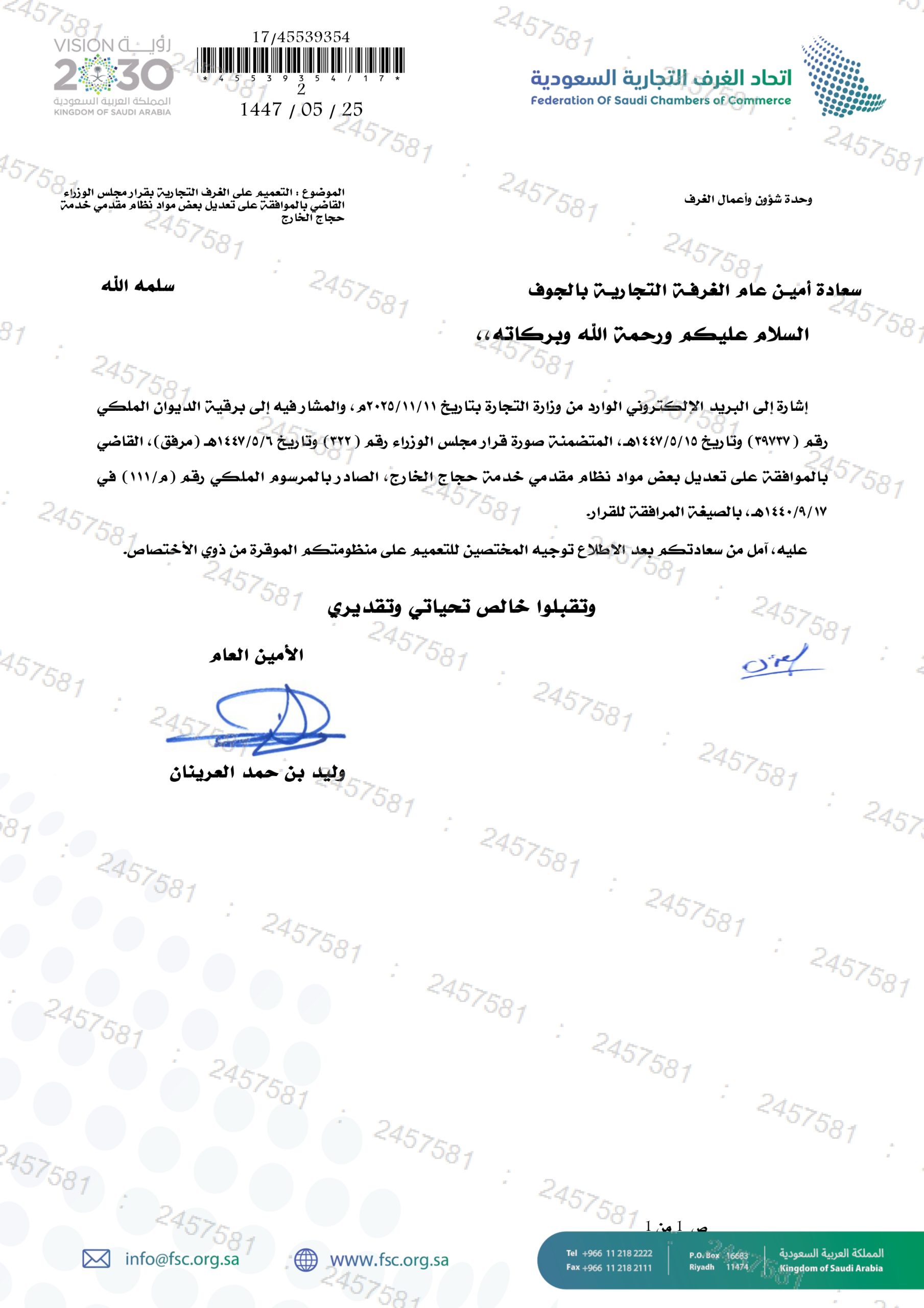 (العربية) التعميم على الغرف التجارية بقرار مجلس الوزراء القاضي بالموافقة على تعديل بعض مواد نظام مقدمي خدمة حجاج الخارج