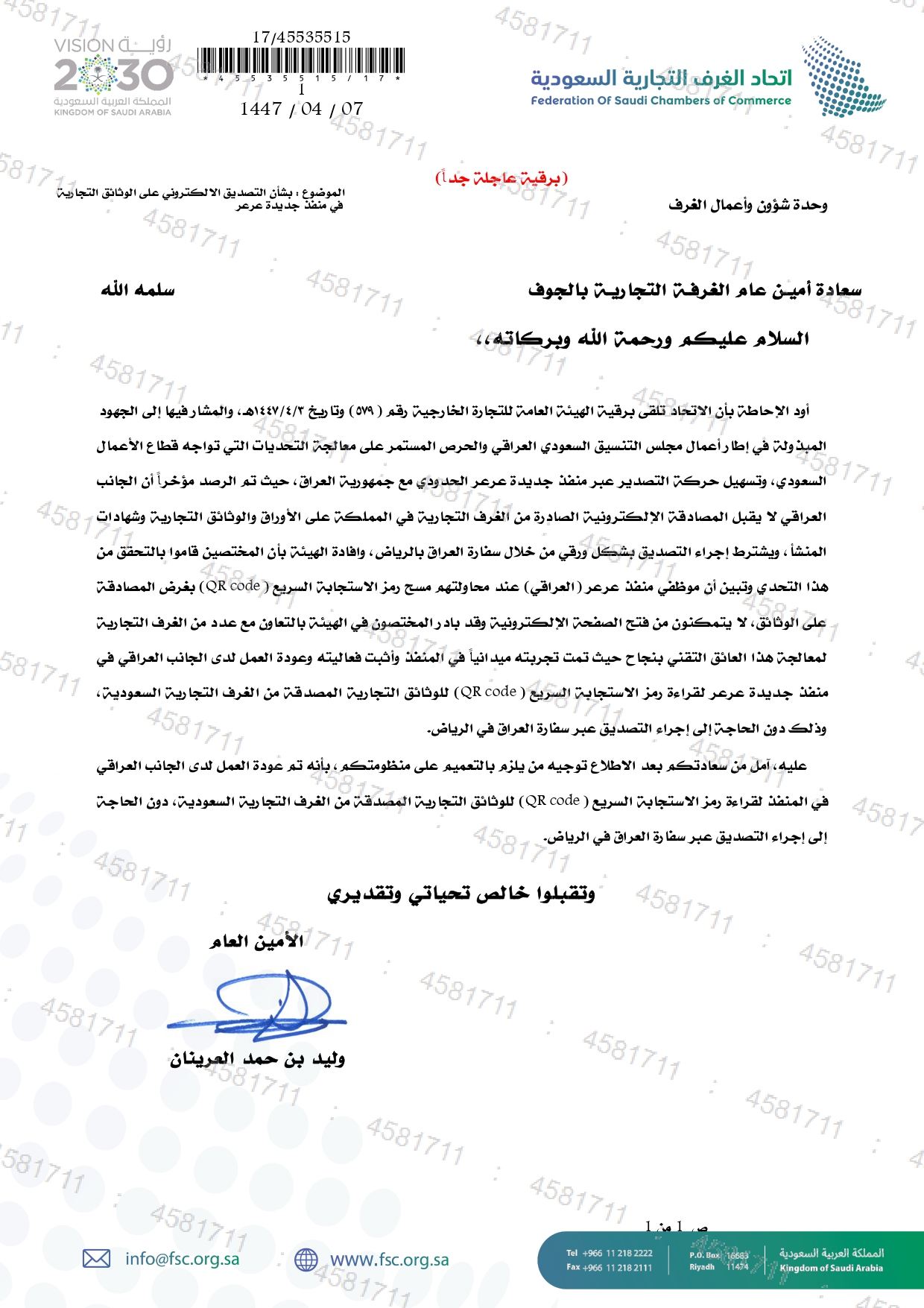 (العربية) بشأن التصديق الإلكتروني على الوثائق التجارية في منفذ جديدة عرعر