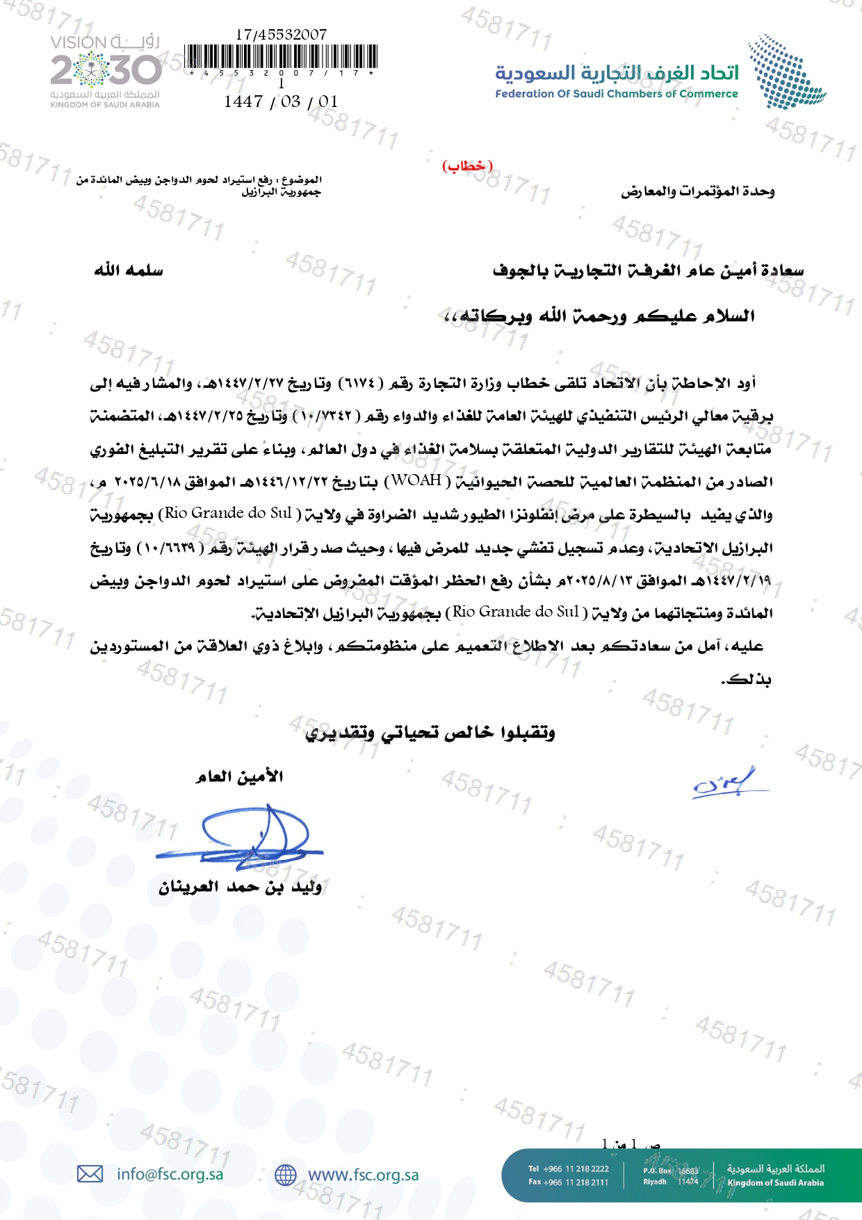 (العربية) رفع الحظر على استيراد لحوم الدواجن وبيض المائدة من جمهورية البرازيل