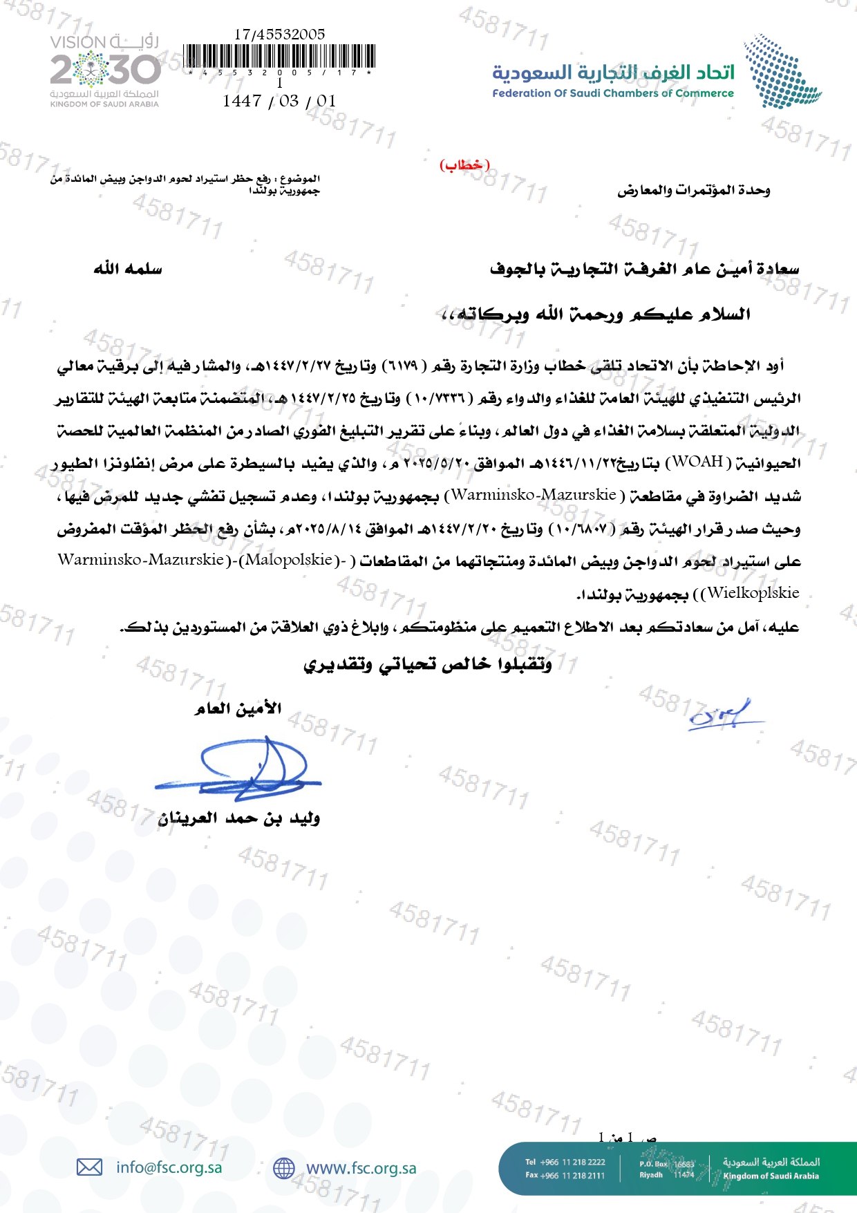 (العربية) رفع الحظر على استيراد لحوم الدواجن وبيض المائدة من عدة مقاطعات بجمهورية بولندا