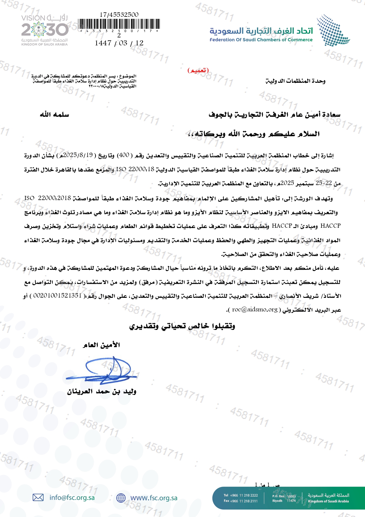 (العربية) دعوة للمشاركة في الدورة التدريبية حول "نظام إدارة سلامة الغذاء طبقاً للمواصفة القياسية الدولية" في القاهرة