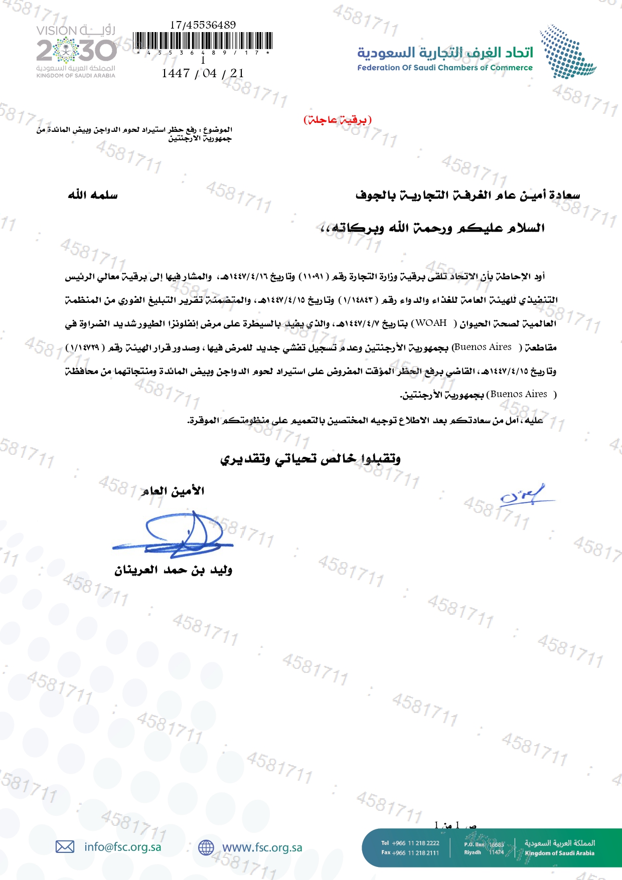 (العربية) رفع حظر استيراد لحوم الدواجن وبيض المائدة من جمهورية الأرجنتين