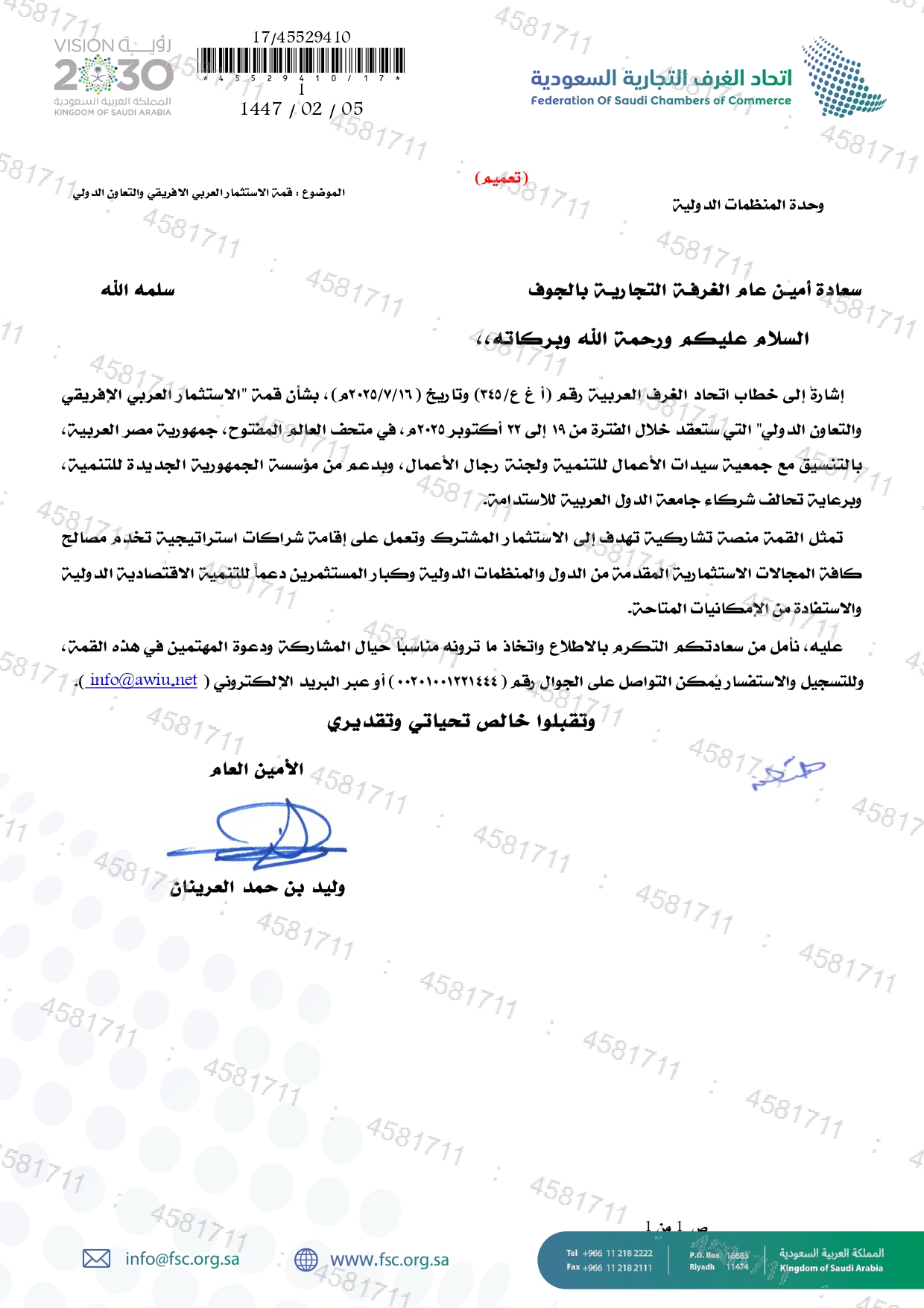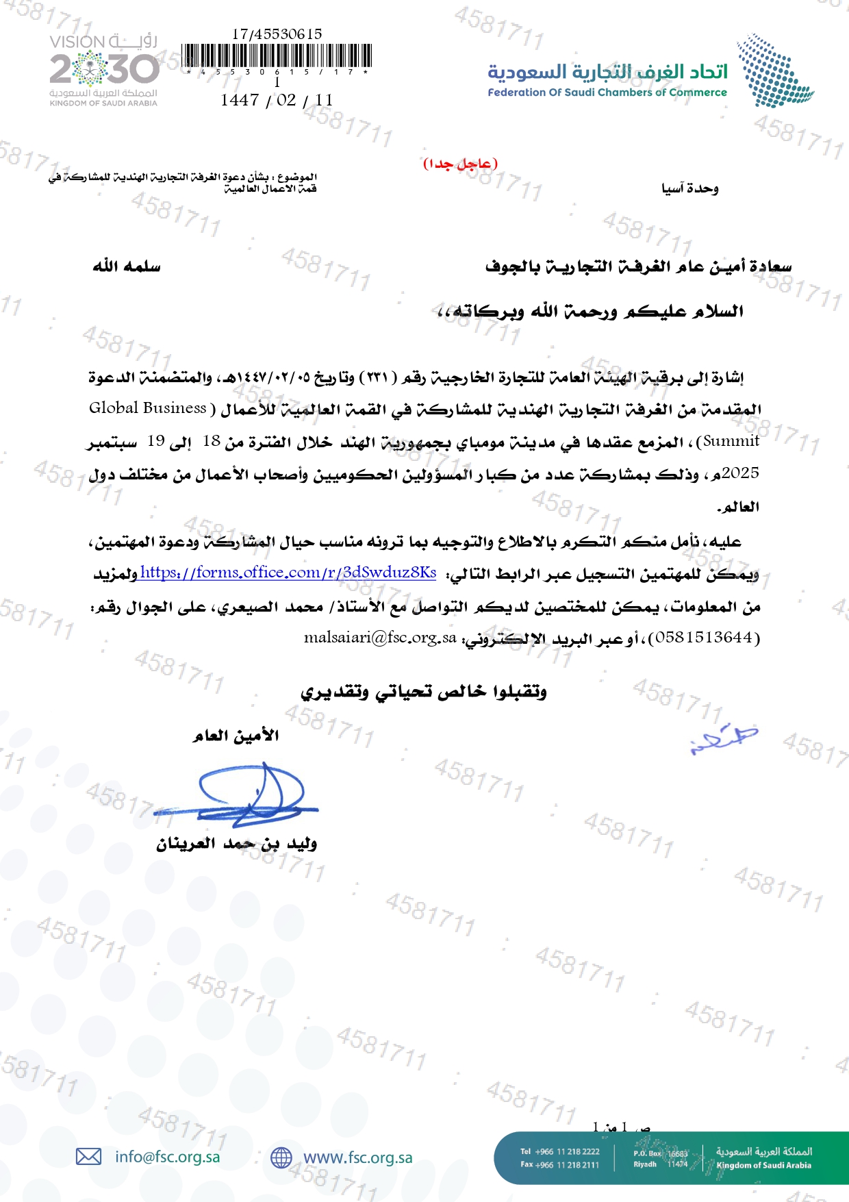 (العربية) بشأن دعوة الغرفة التجارية الهندية للمشاركة في القمة العالمية للأعمال