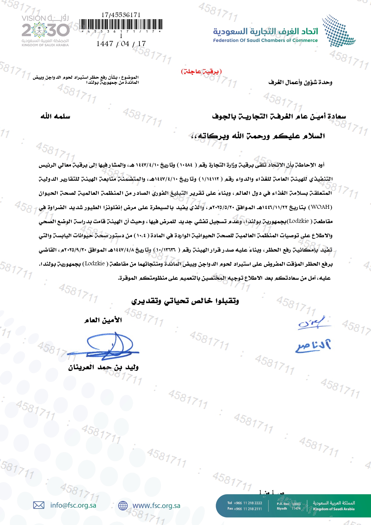 (العربية) رفع الحظر على استيراد لحوم الدواجن وبيض المائدة من جمهورية بولندا