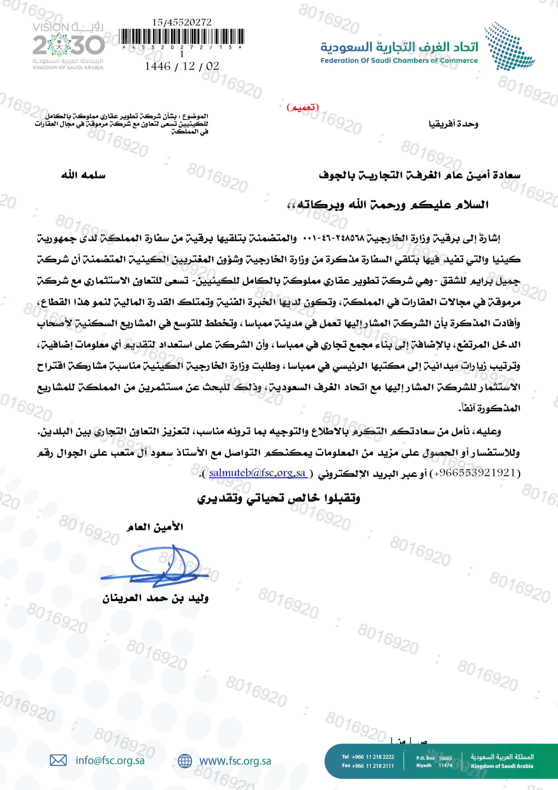 (العربية) بشأن رغبة شركة تطوير عقاري كينية مملوكة بالكامل للكينيين في التعاون مع شركة سعودية مرموقة في مجال العقارات