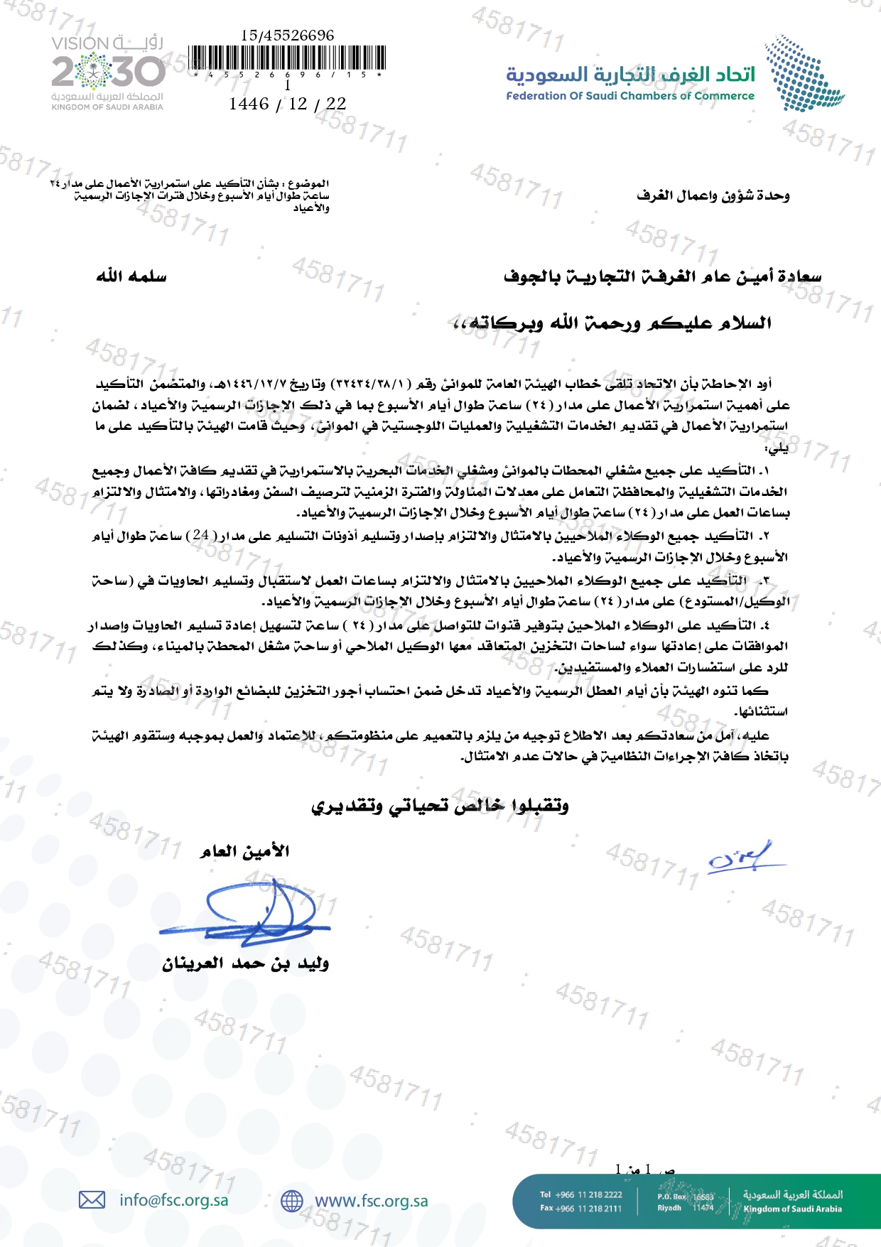 (العربية) بشأن التأكيد على استمرارية أعمال خدمات الموانئ على مدار ٢٤ ساعة طوال أيام الأسبوع وخلال فترات الإجازات الرسمية والأعياد