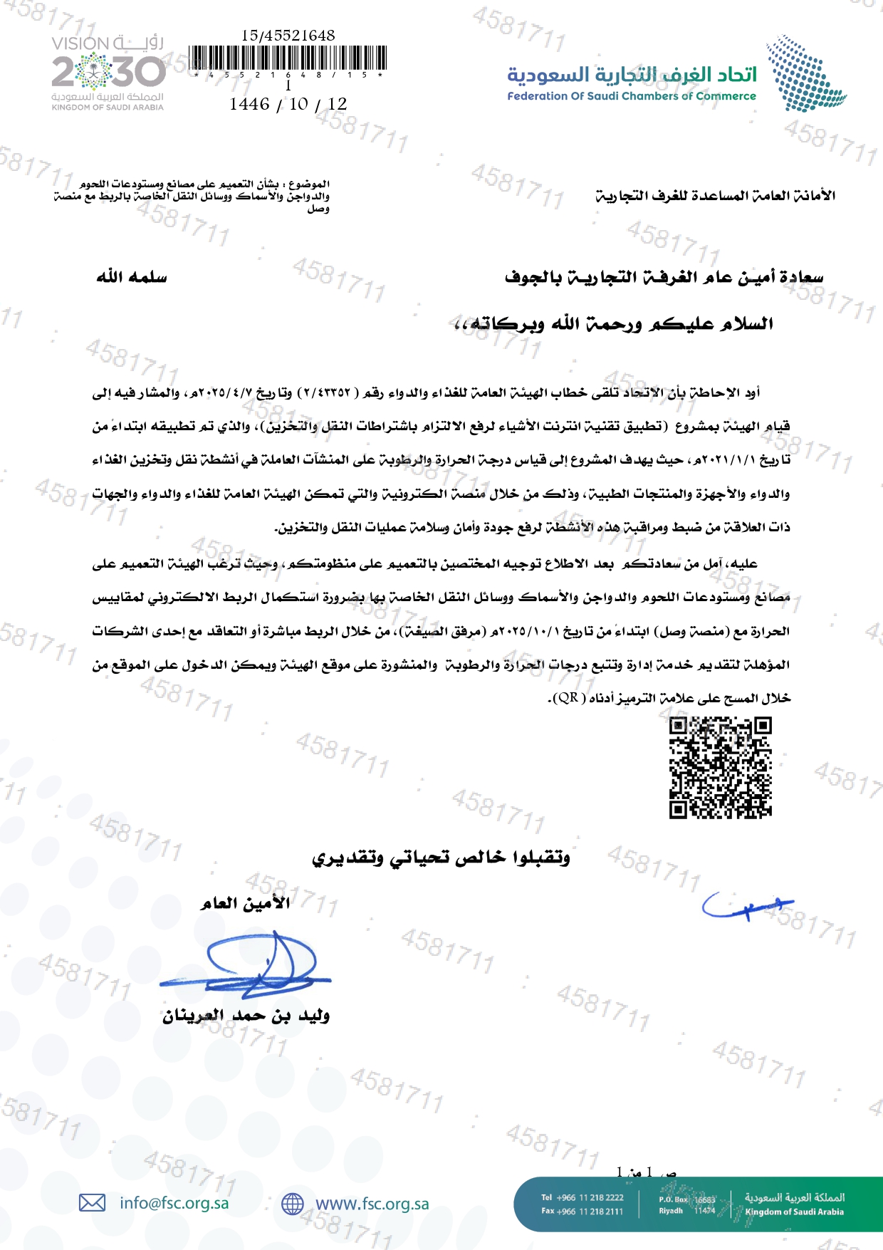 (العربية) بشأن ربط مصانع ومستودعات اللحوم والدواجن والأسماك ووسائل النقل الخاصة مع "منصة وصل"