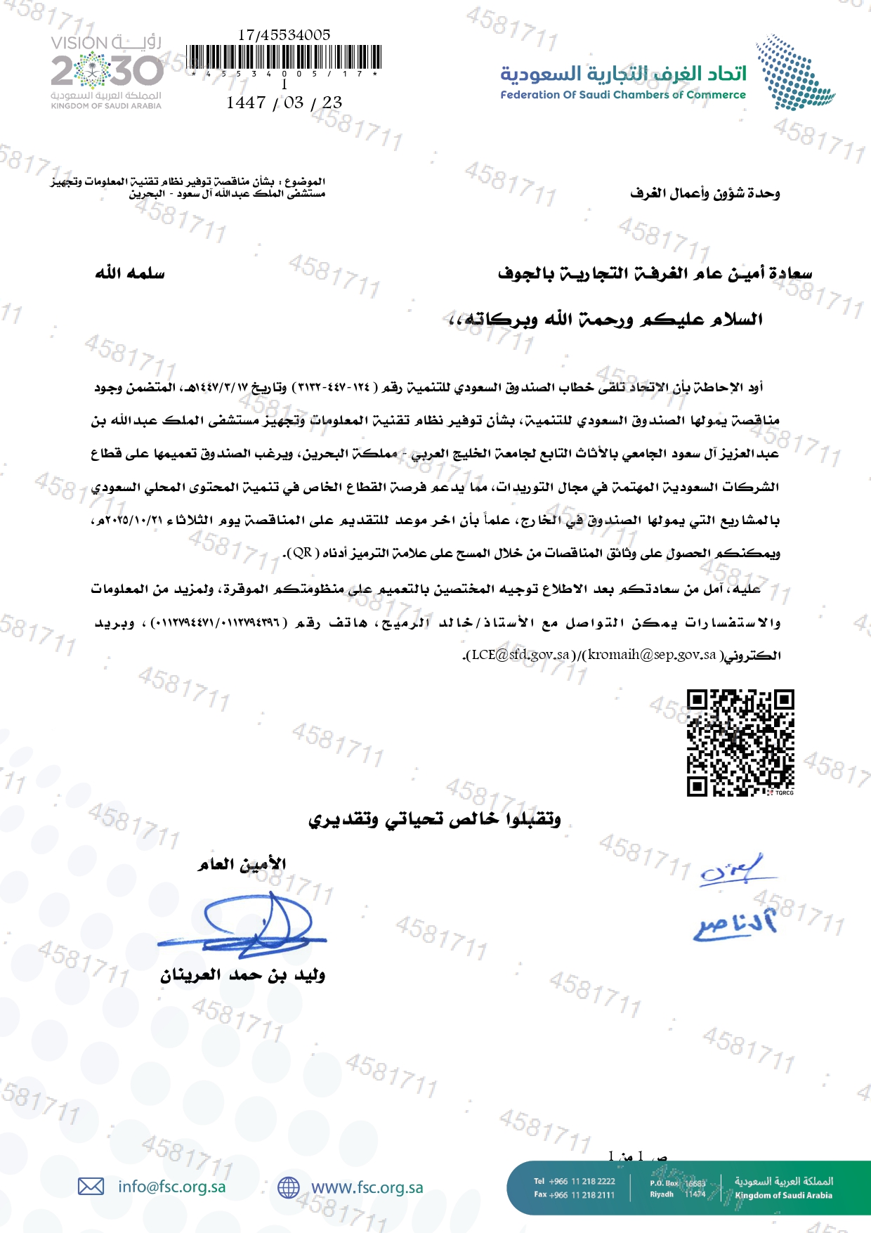 (العربية) بشأن مناقصة توفير نظام تقنية المعلومات وتجهيز مستشفى الملك عبدالله بن عبدالعزيز آل سعود - البحرين