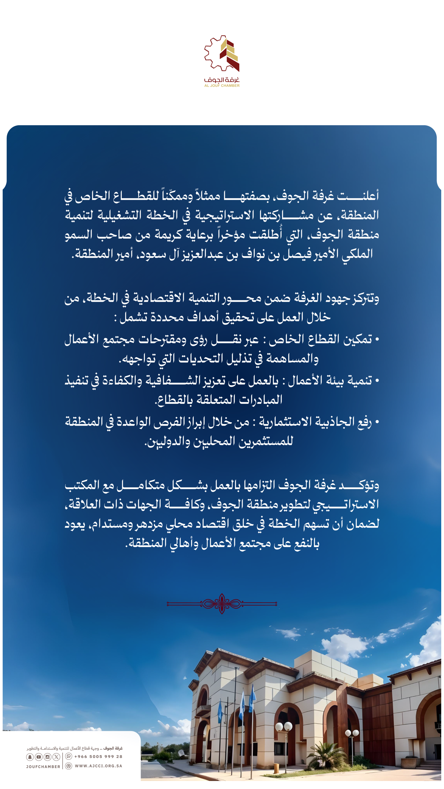 أعلنت غرفة الجوف، بصفتها ممثلاً وممكّناً للقطاع الخاص في المنطقة، عن مشاركتها الاستراتيجية في الخطة التشغيلية لتنمية منطقة الجوف، التي أُطلقت مؤخراً برعاية كريمة من صاحب السمو الملكي الأمير فيصل بن نواف بن عبد العزيز آل سعود، أمير المنطقة.
