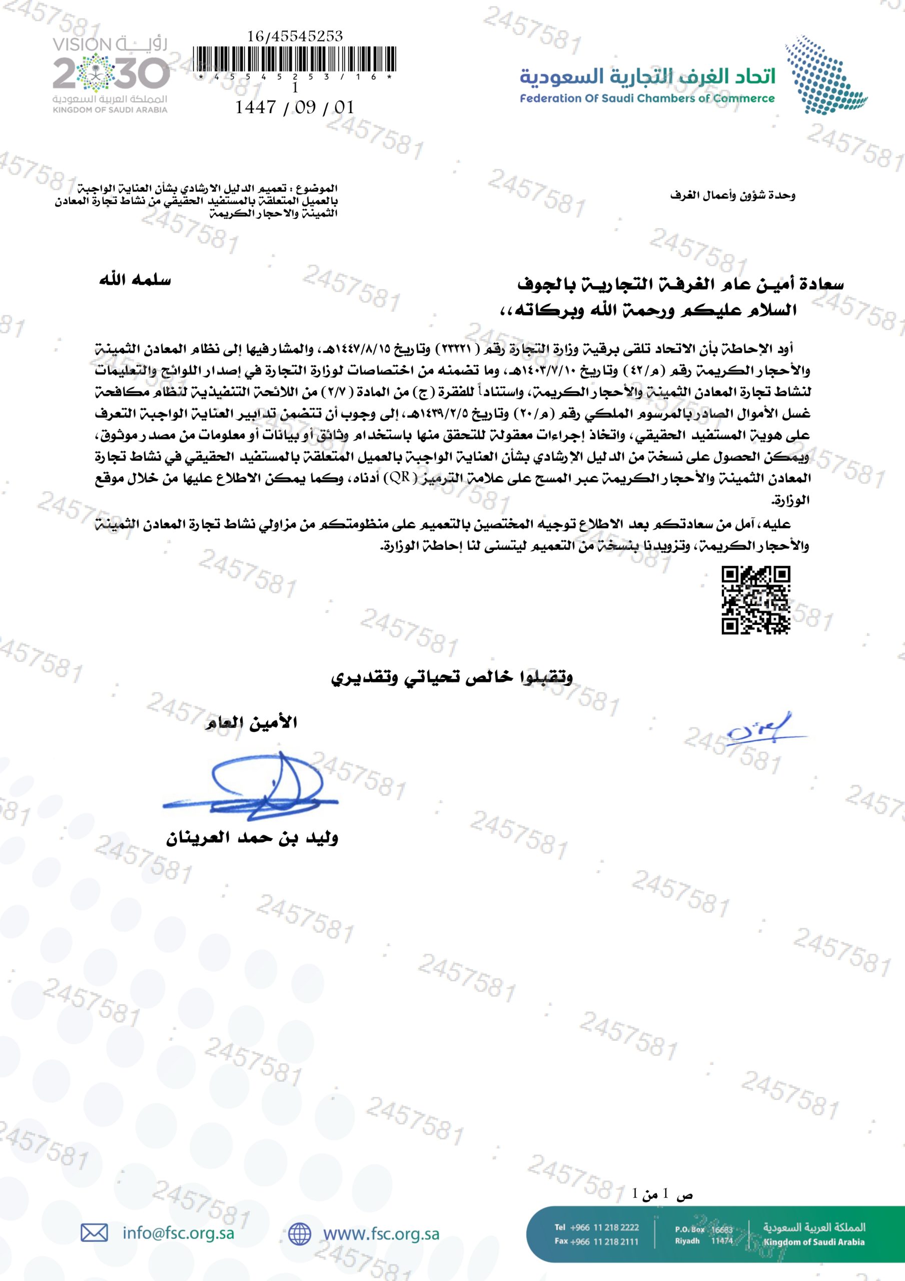 تعميم بشأن الدليل الارشادي بشأن العناية الواجبة بالعميل المتعلقة بالمستفيد الحقيقي من نشاط تجارة المعادن الثمينة والاحجار الكريمة